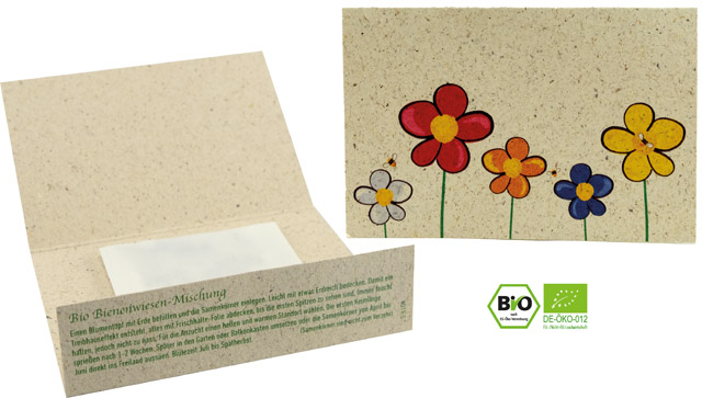 Beschreibung: Im trendigen Klappkärtchen aus Graspapier befindet sich ein Tütchen mit unserer bienenfreundlichen Bio-Samenmischung. Ein Werbeeindruck oder eine individuelle Gestaltung des Kärtchens ist bereits ab 250 Stück möglich.