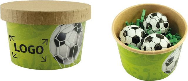 Beschreibung: Ein natürlicher Becher für leckere Schokofußbälle. Ein willkommenes Giveaway für Sportbegeisterte und Schokoladenfans. Nutzen Sie die Banderole für Ihren Werbeeindruck oder, auch ab 250 Stück, für eine eigene Gestaltung.