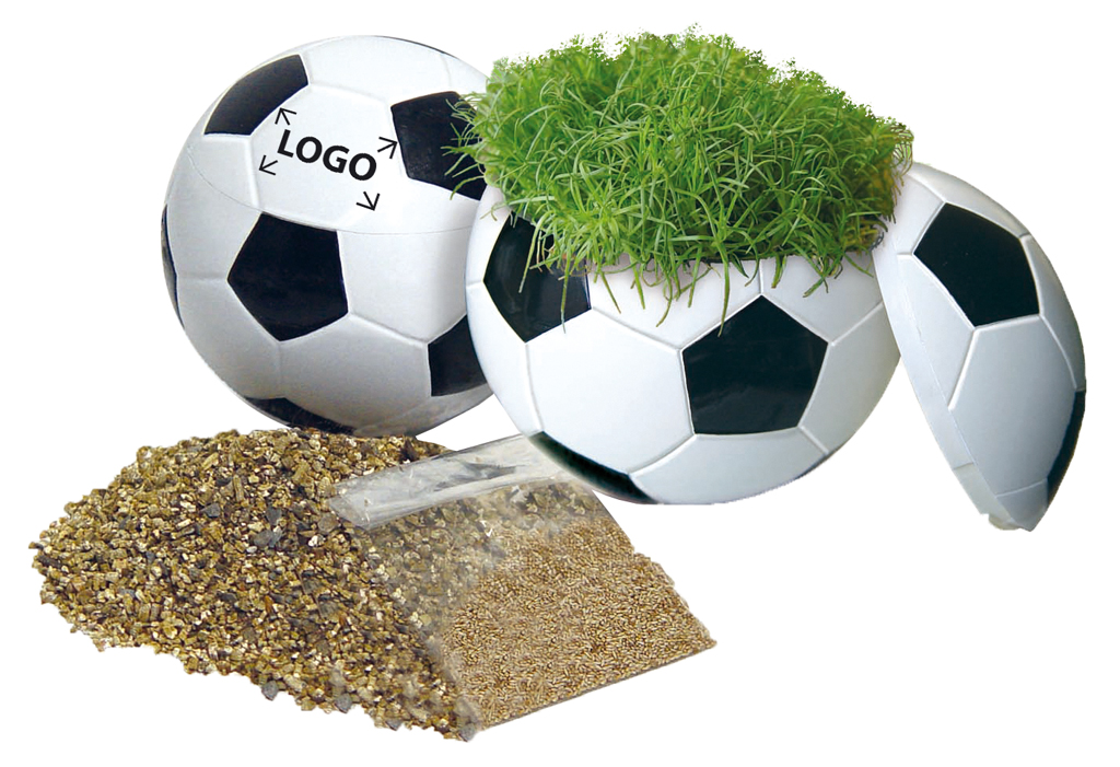 Beschreibung: Holen Sie sich das Ballgefühl in Ihre Werbung. Deckel abnehmen, ansäen und wachsen lassen. Schon nach etwa drei Wochen können Sie den ersten Rasenschnitt vornehmen. Platz für Ihren Logoaufdruck gibt es auf dem Ball. Unsere Empfehlung: Tampondruck in das weiße Ball-Feld ab 100 Stück.