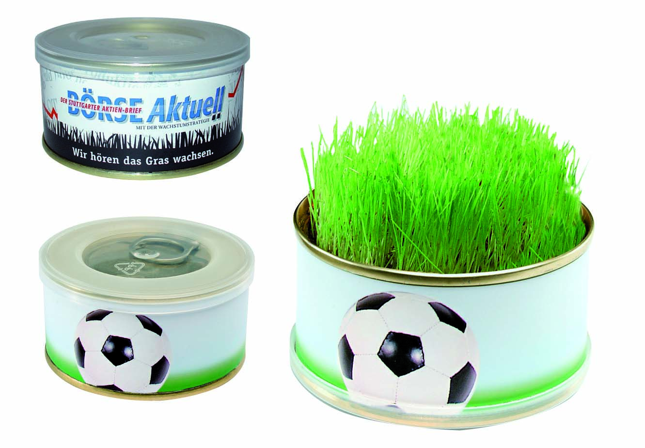 Beschreibung: Mit dieser kleinen Weißblechdose haben Sie Ihre Arena auf dem Schreibtisch. Die Grassamen sind bereits im Substrat eingelegt. Öffnen, gießen und das grüne Gras sprießt schon nach ca. 10 Tagen. Rund um die Dose bietet die Banderole Platz für Ihre Werbebotschaft auf dem Standardmotiv oder eine eigene Gestaltung der Banderole, jeweils ab 250 Stück.
