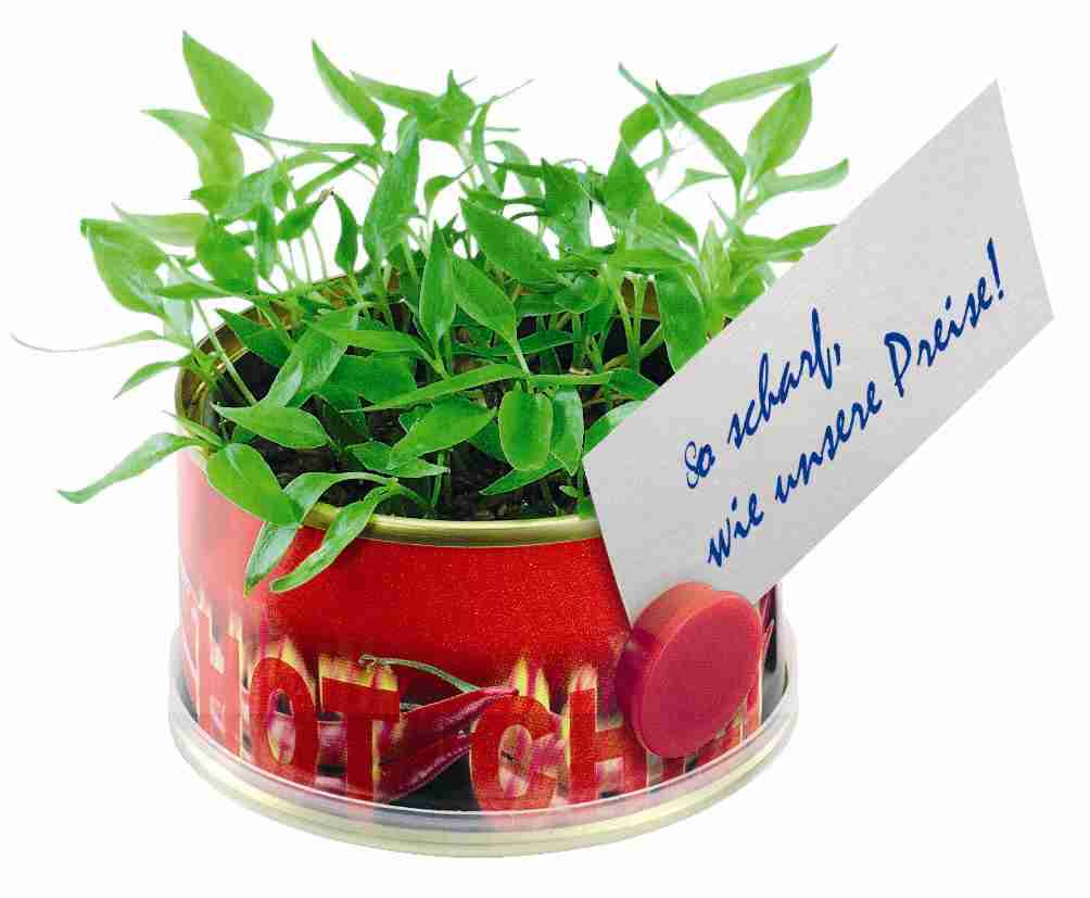 Beschreibung: Die Metalldose mit Aufreißdeckel. Praktisch und klein zum Überreichen. Im Format Ø 73 x 38 mm mit transparentem Deckel und darunter verbergen sich die Pflanzanleitung sowie ein Magnet. Die Farbe des Magnets ist wählbar. Standard: grün, rot, gelb. Diesen entnehmen und Ihre Visitenkarte beim Überreichen an die Dose pinnen. Auch ohne Magnet lieferbar. Kombinieren Sie Ihre Samen und Farben mit eigener Gestaltung der umlaufenden Banderole bereits ab 250 Stück.