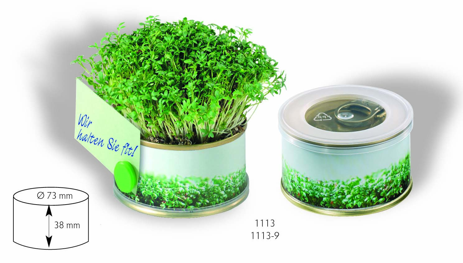 Beschreibung: Die Metalldose mit Aufreißdeckel. Praktisch und klein zum Überreichen. Im Format Ø 73 x 38 mm mit transparentem Deckel und darunter verbergen sich die Pflanzanleitung sowie ein Magnet. Die Farbe des Magnets ist wählbar. Standard: grün, rot, gelb. Diesen entnehmen und Ihre Visitenkarte beim Überreichen an die Dose pinnen. Auch ohne Magnet lieferbar. Kombinieren Sie Ihre Samen und Farben mit eigener Gestaltung der umlaufenden Banderole bereits ab 250 Stück.