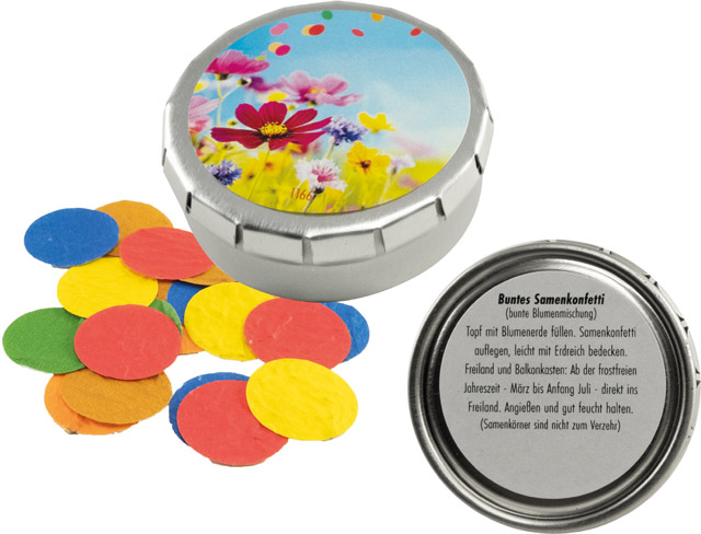 Beschreibung: Buntes Samenkonfetti handlich verpackt. Die formschöne Dose ist ein sympathisches Giveaway, das gerne angenommen wird. Ein Werbeeindruck oder eine individuelle Gestaltung des Etiketts ist bereits ab 250 Stück möglich.