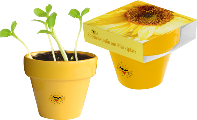 Beschreibung: Farbenfreudig wie die Natur ist dieses lackierte Tontöpfchen. Wählen Sie Ihre Farbe aus: weiss, gelb oder rot. Die Samensorten, abgestimmt auf Ihre Werbebotschaft, sind ebenfalls wählbar. Eingelegt in dem Tontopf Colour sind Samen und Erdtablette. Die Banderole bietet Platz für den Werbeaufdruck ab 250 Stück oder aber eine eigene Gestaltung. Dafür bekommen Sie die Vorlage von uns gestellt. Eine weitere Bedruckung bietet sich direkt auf dem farbigen Topf an. Dieser transportiert sichtbar während der Wachstumsphase Ihre Botschaft. Bringen Sie Farbe in Ihr Unternehmen mit diesem sympathischen Töpfchen.