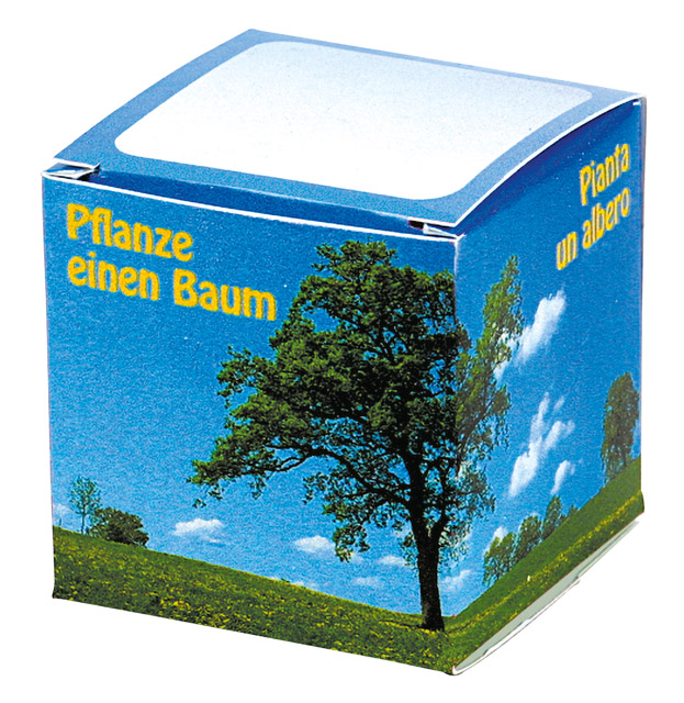Beschreibung: Dieser praktische Würfel enthält ein Tontöpfchen Ø 4 cm, Erdtablette, Pflanzanleitung und Samen der Robinie. Standardmotiv auf sechs Seiten. Auf dem Deckel ist Platz für den Werbeeindruck ab 250 Stück. Eine eigene Gestaltung der Würfelpackung, 50 x 50 x 50 mm nach Ihren Wünschen ab 250 Stück.