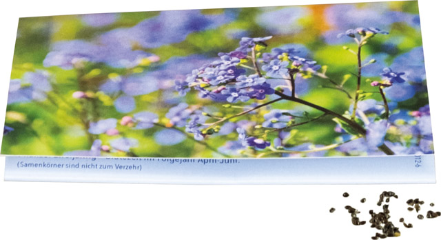 Beschreibung: Die ideale Beilage für Ihre Werbebotschaft. Verschiedene Standardmotive und Samensorten stehen zur Auswahl. Mit dieser Karte haben Sie, mit Ihrer eigenen Gestaltung der Vorder- und Rückseite (außen), einen preiswerten Mailingbegleiter. Die Samentüte wird innen eingelegt und Sie können die Sorte der Samen, passend zu Ihrer Werbeaussage und Jahreszeit, selbst wählen. Der Druck erfolgt in das Standardmotiv oder eine eigene Gestaltung, jeweils ab 250 Stück. Samen: Vergissmeinnicht