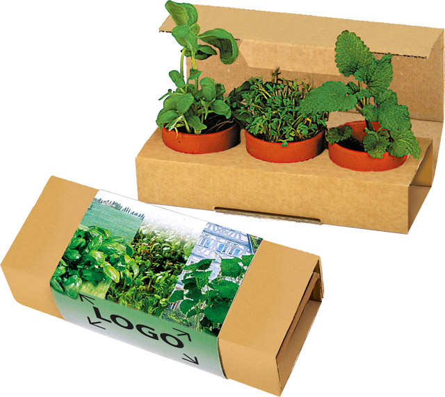 Beschreibung: Der Naturkarton mit den kleinen Tontöpfchen macht Freude beim Überreichen. Aller gesunden Dinge sind drei. Mit den drei Tontöpfchen, Erdtabletten und Samen haben Sie ein richtiges Präsentpäckchen. Eine Anleitung zur Aussaat ist auf der Innenseite der Banderole aufgedruckt. Der Werbedruck erfolgt auf dem Standardmotiv der Banderole. Eine eigene Gestaltung der Banderole ist bereits ab 250 Stück möglich.