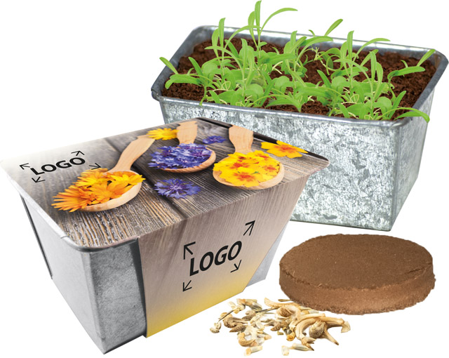 Beschreibung: Metallic, modern, der kleine Zinkbehälter für die Anzucht Ihrer wachsenden Grüße. Eingelegt in das Wachstums-Kästchen sind Erdtablette und esbare Blüten-Samen. Die umlaufende Banderole bietet Platz für Ihre Werbebotschaft ab 250 Stück. Eine eigene Gestaltung der Banderole ist ebenfalls ab 250 Stück realisierbar.