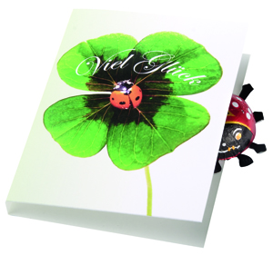 Beschreibung: Nicht nur zu Silvester, sondern das ganze Jahr über wird Glück benötigt. Dieses Klappkärtchen enthält einen Glückskäfer (6 g) aus Vollmilch-Schokolade. Platz für den Werbedruck ist auf dem Standardmotiv der Karte oder eine eigene Gestaltung, jeweils ab 250 Stück.