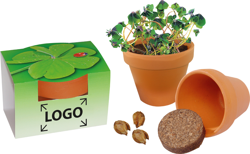 Inhalt: Tontöpfchen Ø 4 cm, Erdtablette, Glückskleezwiebelchen