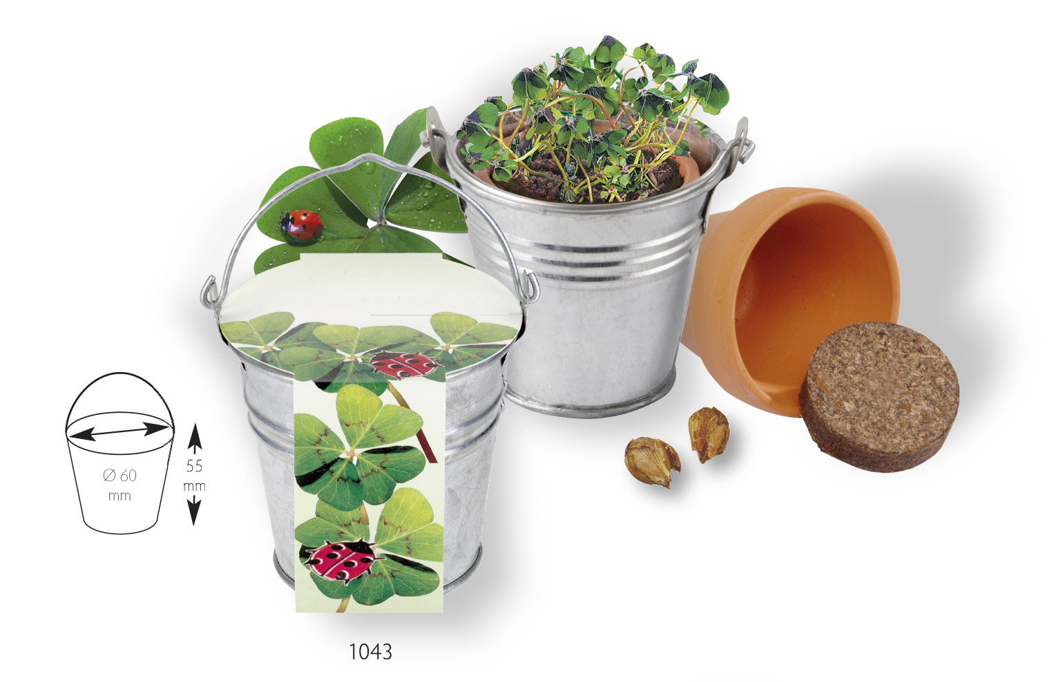 Inhalt: Zinkeimerchen 5,5 cm, Tontöpfchen Ø 4 cm, Erdtablette, Glückskleezwiebelchen