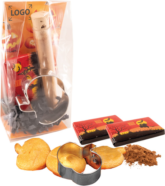 Beschreibung: Ein sympathischer Gruß zu Halloween. Mit dem Backförmchen und der Kürbis-Gewürzmischung lassen sich schnell leckere Plätzchen zubereiten. Die Schokoladentäfelchen mit Halloween-Motiv ergänzen dieses Giveaway perfekt. Ab 250 Stück kann der Einleger im Standardmotiv mit einem Werbeeindruck oder auch vollständig individuell gestaltet werden.