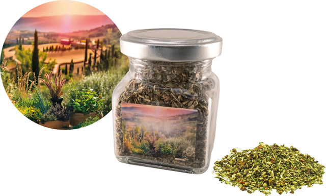 Beschreibung: Das nachhaltige und wiederverwendbare Gläschen enthält eine Mischung italienischer Kräuter. Ein Genuss für Gerichte à la Bella Italia. Ein Werbeeindruck oder Ihre individuelle Gestaltung des Etiketts ist bereits ab 250 Stück möglich.