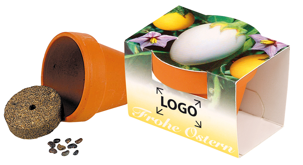 Beschreibung: Der Eierbaum ist eine Topfpflanze und bildet nach der Blüte kleine eiförmige Früchte. Diese gehören zu der Gattung der Aubergine. Ein Werbeaufdruck im Standardmotiv oder eine eigene Gestaltung der Banderole ist ab 250 Stück möglich.