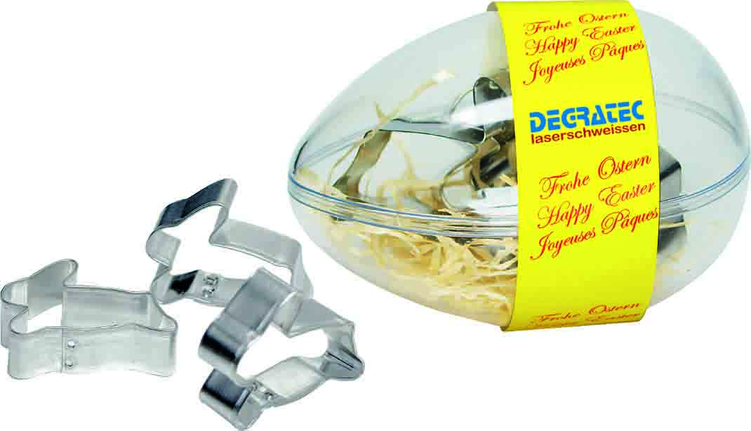 Beschreibung: Osterzeit ist Back-Zeit. Drei Weißblech-Ausstechform in Hasen-Form, eingelegt in transparentem Ei. Ein Backrezept befindet sich auf der Banderole aufgedruckt. Hier ist auch Platz für den Werbeaufdruck. Auch eine eigene Gestaltungnder Banderole kann ab 250 Stück erfolgen.