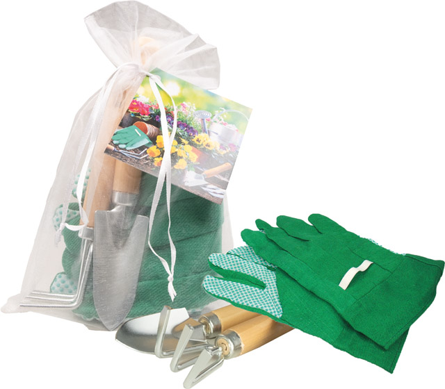 Beschreibung: Die handlichen Gartengeräte und die Gartenhandschuhe sind unverzichtbar für die kleinen Gartenarbeiten. Über dieses sympathische Werbepräsent freuen sich Ihre Kunden. Ein Werbeeindruck oder Ihre individuelle Gestaltung des Anhängekärtchens ist bereits ab 250 Stück möglich.