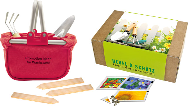 Beschreibung: Der Utensilo „Garten“ ist perfekt ausgestattet für die erste Aussaat, mit einer handlichen Harke, Schaufel, Samentütchen (Zwergsonnenblume, Vergissmeinnicht, bunte Blumenmischung) und Holzstecketiketten. Der Werbedruck erfolgt auf dem Standardmotiv, ab 250 Stück ist eine individuelle Banderolengestaltung möglich.