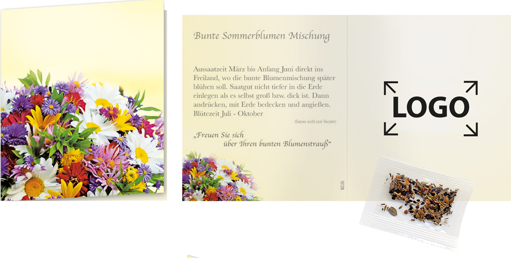 Beschreibung: Das Klappkärtchen ist ideal als Briefpostbeigabe oder zum Überreichen. Die Standardmotive bieten eine volle Innenfläche für Ihre Werbebotschaft. Der Druck in das Standardmotiv oder eine komplett eigene Gestaltung innen und außen ist ab 250 Stück möglich. Samen: bunte Blumenmischung