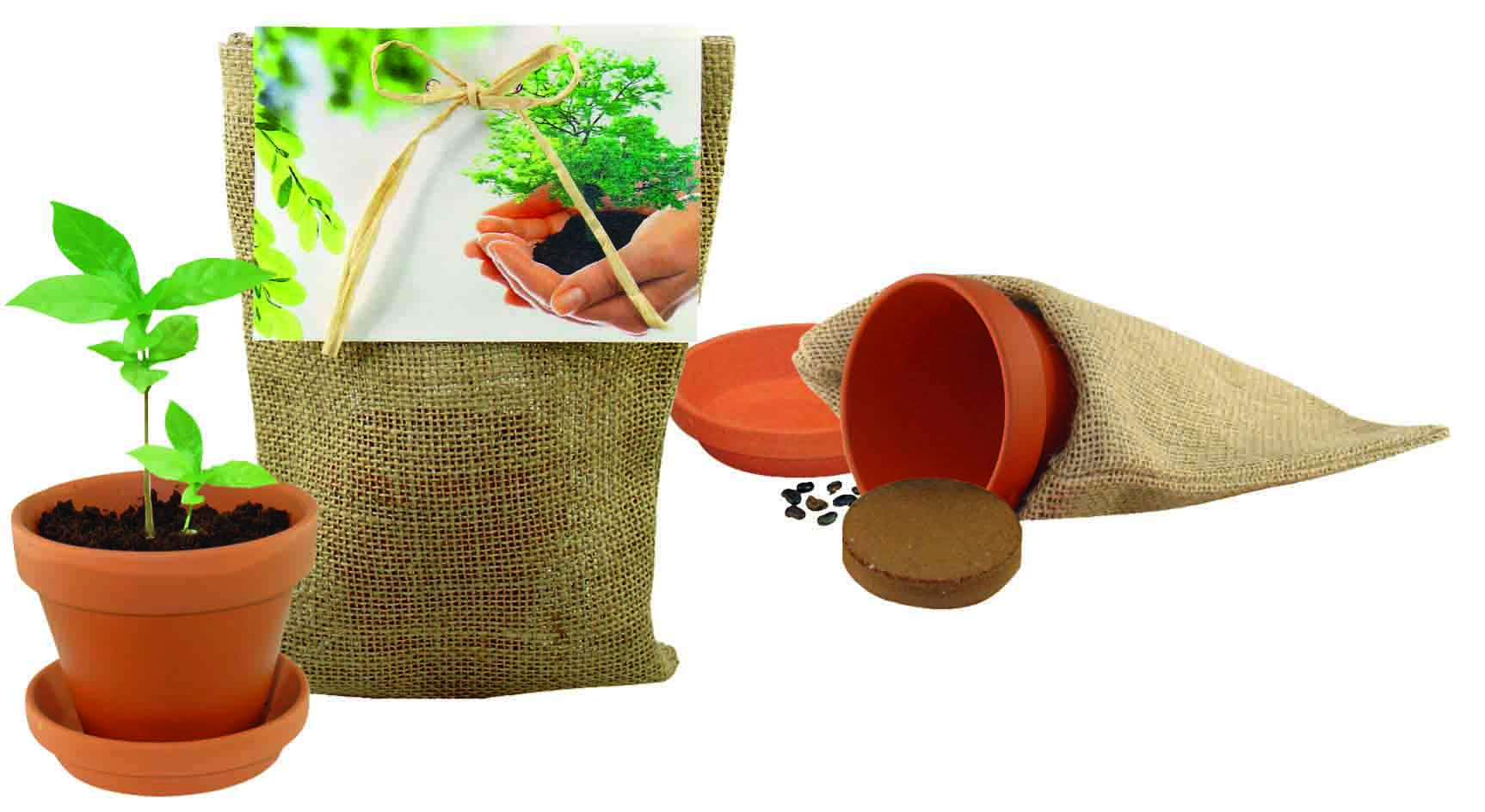 Beschreibung: Ein Stück Natur im Jutesäckchen mit Tontopf und Unterteller, Erdtablette und Baumsamen. Die Robinie wird gerne an Straßenrändern gepflanzt, da sie sich günstig auf die CO2-Emission auswirkt. Ein sehr robuster und widerstandsfähiger Baum, mit weißen Blütentrauben und einer lichten Krone. In der ersten Wachstumsphase ist die Robinie als Pflanze für den Balkonkasten oder Kübel gut geeignet. Schnelles Wachstum, im ersten Jahr ca. 20-30 cm. Ausgewachsen ist die Robinie nach 50 Jahren und kann eine Höhe von ca. 30 m erreichen. Für den Werbeaufdruck ist Platz auf dem Standardmotiv im Header oder eine eigene Gestaltung des Headers, jeweils ab 250 Stück.