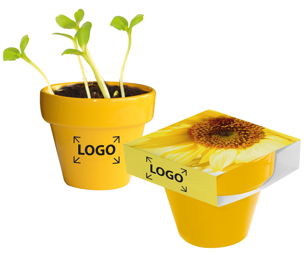 Beschreibung: Farbenfreudig wie die Natur ist dieses lackierte Tontöpfchen. Wählen Sie Ihre Farbe aus: weiss, gelb oder rot. Die Samensorten, abgestimmt auf Ihre Werbebotschaft, sind ebenfalls wählbar. Eingelegt in dem Tontopf Colour sind Samen und Erdtablette. Die Banderole bietet Platz für den Werbeaufdruck ab 250 Stück oder aber eine eigene Gestaltung. Dafür bekommen Sie die Vorlage von uns gestellt. Eine weitere Bedruckung bietet sich direkt auf dem farbigen Topf an. Dieser transportiert sichtbar während der Wachstumsphase Ihre Botschaft. Bringen Sie Farbe in Ihr Unternehmen mit diesem sympathischen Töpfchen.