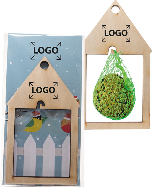 Beschreibung: Das Vogelhäuschen aus Holz lässt sich überall aufhängen und mit einem Meisenknödel bestücken. Bald schon können die Vögel bei Ihrem Festmahl beobachtet werden. Die Karte kann mit Ihrem Eindruck versehen oder, ebenfalls ab 250 Stück, individuell gestaltet werden.