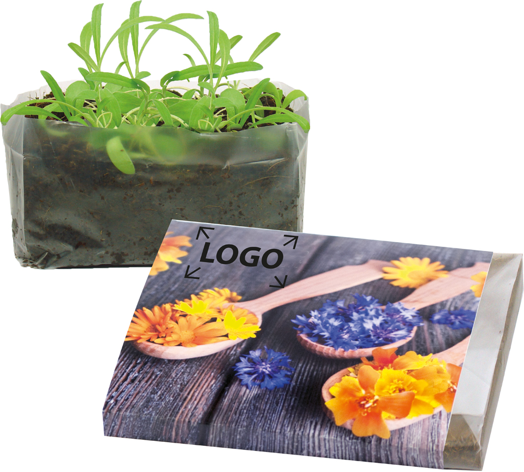 Beschreibung: Die gewachsenen essbaren Blüten der Kornblume, der Ringelblume und der Gewürztagetes sind nicht nur als Pflanzen eine dekorative Augenweide, sondern auch ein ungewöhnliches Geschmackserlebnis. Ein echter Sympathieträger für Ihre Werbebotschaft. Der Schuber bietet Platz für Ihre Werbeanbringung auf dem Standardmotiv oder eine eigene Gestaltung, jeweils 250 Stück möglich.