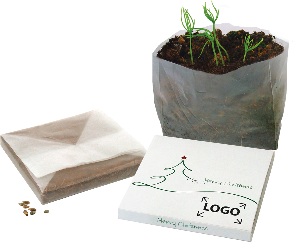 Beschreibung: Das quadratische Wachstumsbehältnis beinhaltet die Erdtablette und Fichte-Samen für Ihren Weihnachtsbaum. Durch die flache Form lässt es sich gut überreichen. Einfach wässern und schon nach kurzer Zeit wächst eine kleine Baum-Pflanze. Platz für Ihren Werbeeindruck ist auf dem Standardmotiv des Schubers oder eine eigene Gestaltung, jeweils ab 250 Stück.