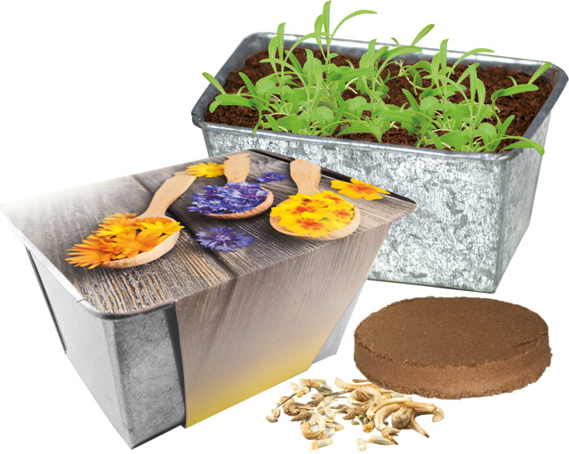 Beschreibung: Metallic, modern, der kleine Zinkbehälter für die Anzucht Ihrer wachsenden Grüße. Eingelegt in das Wachstums-Kästchen sind Erdtablette und esbare Blüten-Samen. Die umlaufende Banderole bietet Platz für Ihre Werbebotschaft ab 250 Stück. Eine eigene Gestaltung der Banderole ist ebenfalls ab 250 Stück realisierbar.