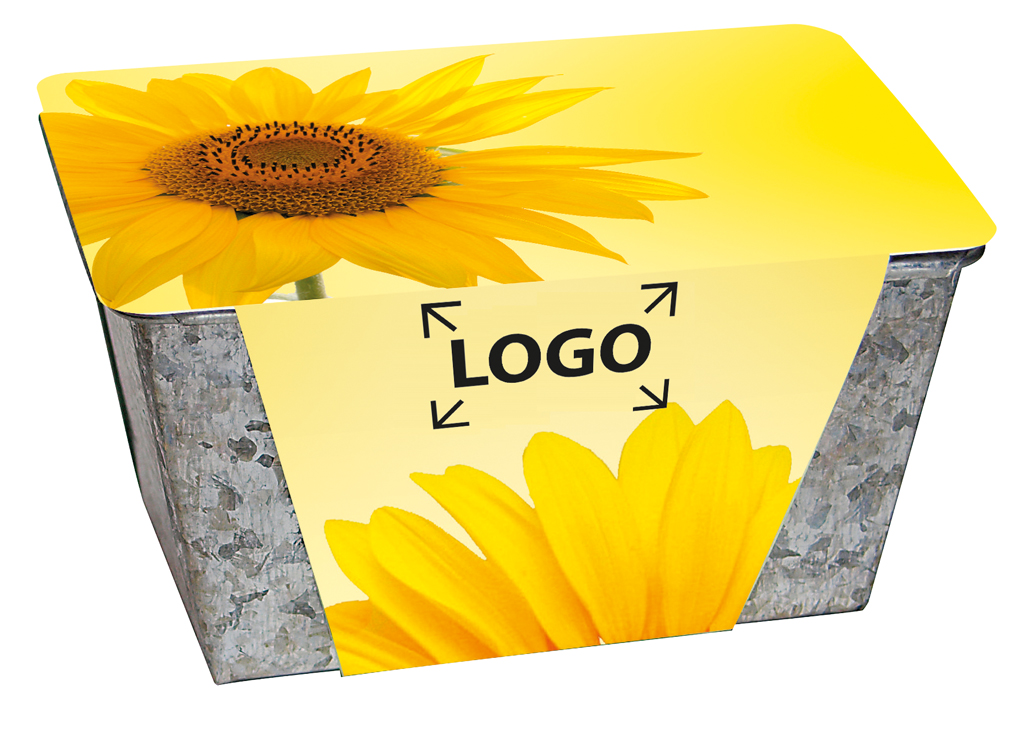 Beschreibung: Metallic, modern, der kleine Zinkbehälter für die Anzucht Ihrer wachsenden Grüße. Eingelegt in das Wachstums-Kästchen sind Erdtablette und Zwergsonnenblumen-Samen. Die umlaufende Banderole bietet Platz für Ihre Werbebotschaft ab 250 Stück. Eine eigene Gestaltung der Banderole ist ebenfalls ab 250 Stück realisierbar.