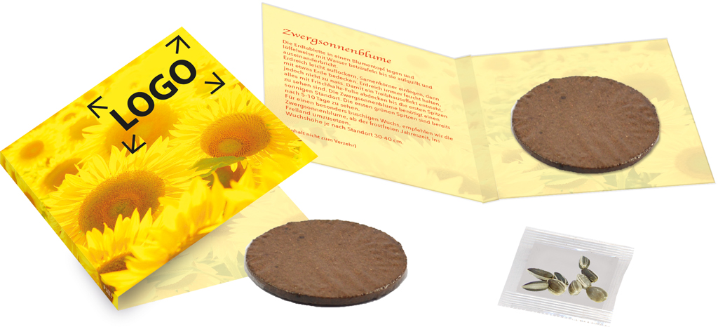 Beschreibung: Dieses Kärtchen beinhaltet alles für die Anzucht und das Wachstum der eigenen Zwergsonnenblume. Eine Erdtablette und die Samenkörner sind eingeklebt. Die Pflanzanleitung ist auf der Innenseite des Kärtchens aufgedruckt. Platz für den Werbedruck, ab 250 Stück auf dem Standardmotiv, ist auf der Vorderseite des Kärtchens. Eine eigene Gestaltung ist ebenfalls bereits ab 250 Stück realisierbar.