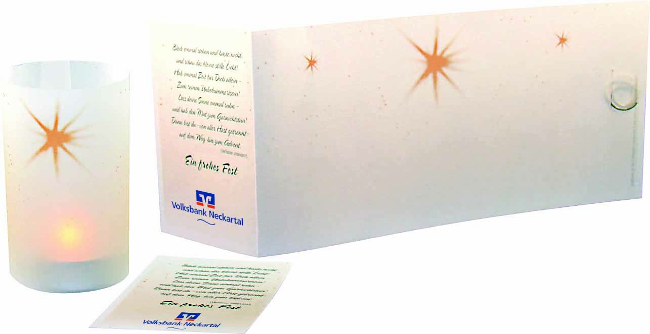 Beschreibung: Diese Weihnachtskarte wird nachhaltig genutz. Nach dem Weihnachtsgruß wird sie einfach zusammengerollt und schmückt zusammen mit einem Teelicht jeden Raum (ohne Teelicht). Platz für den Werbedruck ist auf den Standardmotiven der Karte (Grußcoupon und Lichtrollenteil) oder eine eigene Gestaltung der Karte, jeweils ab 100 Stück. Ein Kuvert ist separat erhältlich Art. 6101