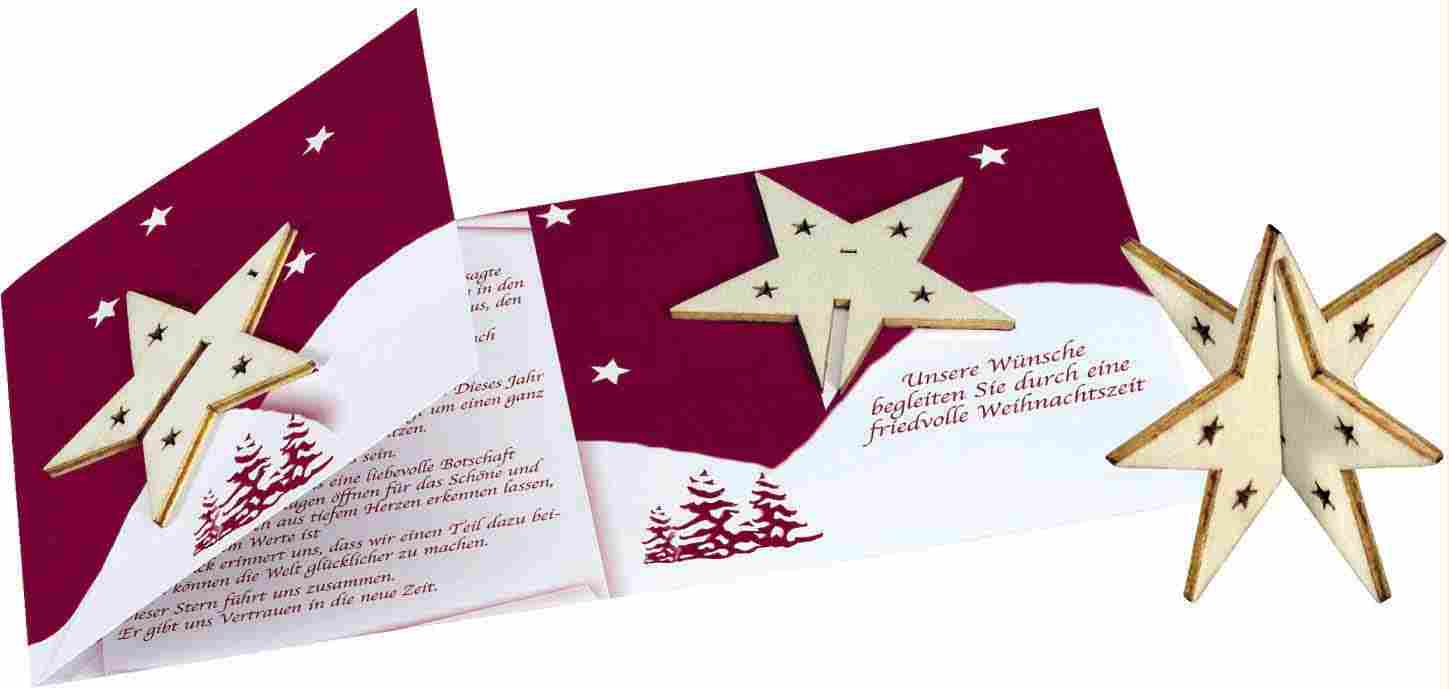Beschreibung: Diese ansprechende Weihnachtskarte enthält 2 Holzteile, die zu einem Holzstern zusammengesteckt werden können. Platz für den Werbedruck ist auf dem Standardmotiv der Karte oder eine eigene Gestaltung, jeweils ab 100 Stück. Ein Kuvert ist separat erhältlich Art. 6101.
