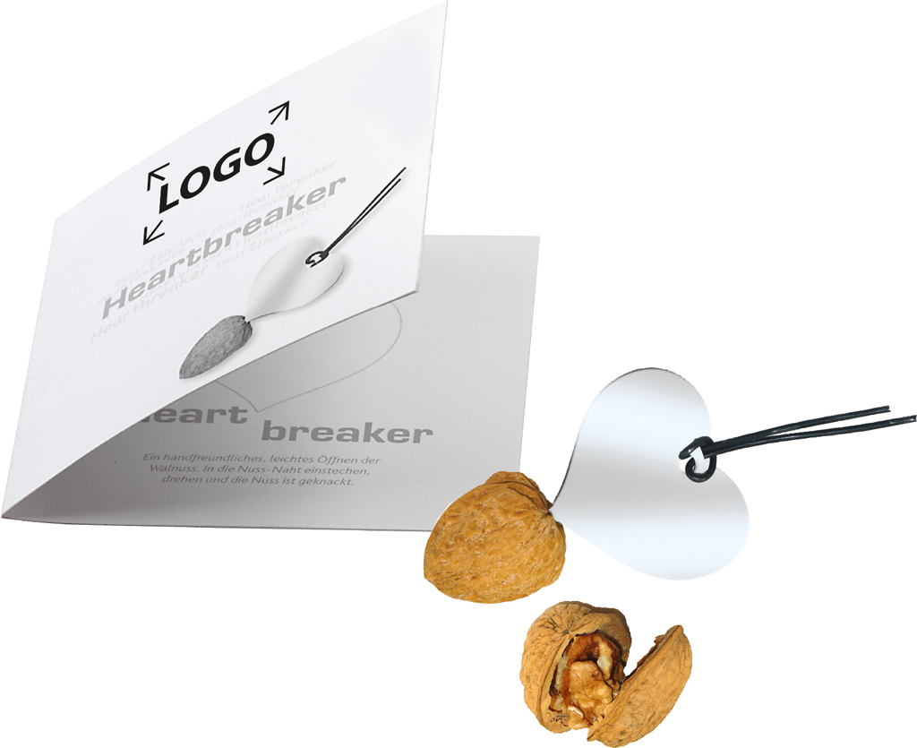 Beschreibung: Diese schöne Weihnachtskarte enthält ein nützliches Design-Objekt für den täglichen Gebrauch. In der Winter- und Weihnachtszeit kommt dieser Nussknacker aus Edelstahl (in Herzform) zum Einsatz. Die Karte enthält keine Nuss. Platz für den Werbedruck ist auf dem Standardmotiv der Karte oder eine eigene Gestaltung, jeweils ab 100 Stück.