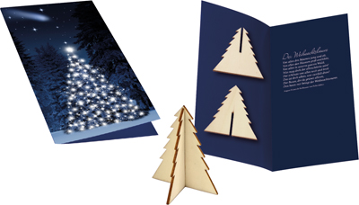 Beschreibung: Ein kleiner Tannenbaum aus Holz zum Stecken und Aufstellen (2 Teile) ist der Inhalt dieser ganz in Blautönen gestalteten Weihnachtskarte. Platz für den Werbedruck ist auf dem Standardmotiv oder eine eigene Gestaltung der Karte, jeweils bereits ab 100 Stück. Ein Kuvert ist separat erhältlich, Artikel 6101