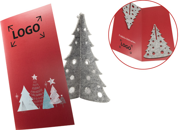 Beschreibung: Ein kleiner Weihnachtsbaum aus Filz für den Schreibtisch. So kommt weihnachtliche Stimmung auch bei der Arbeit auf. Ein immer wieder verwendbares hübsches Giveaway mit Ihren Weihnachtsgrüßen. Für Ihren Werbeeindruck gibt es ausreichend Platz auf dem Standardmotiv der Karte oder, ebenfalls ab 100 Stück, für eine eigene Gestaltung. Ein Kuvert ist separat erhältlich, Artikel 6101
