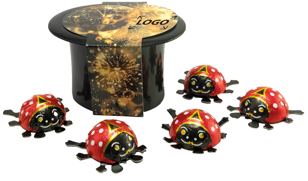 Beschreibung: 5 kleine Schokokäfer versüßen den Jahresausklang und verheißen viel Glück für das neue Jahr. Die Banderole kann im Standardmotiv mit Ihrem Werbeeindruck versehen oder, auch ab 250 Stück, individuell gestaltet werden.