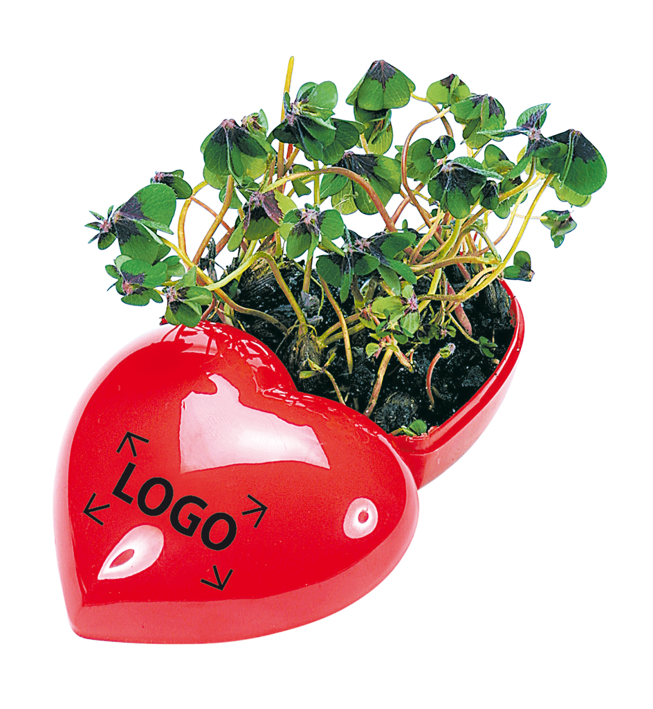 Beschreibung: Ein ansprechendes rotes Herz aus Kuststoff, der Klassiker für den Schreibtisch oder die Fensterbank. Einfach die Zwiebeln nach Anleitung im Unterteil des Herzens einpflanzen. Die Glücksbotschaft mit echtem vierblättrigem Glücksklee wächst schon nach kurzer Zeit heran. Platz für den Werbedruck (ab 100 Stück) ist auf dem Deckel als Tampondruck.
