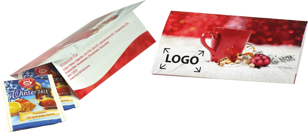 Beschreibung: Dieses Klappkärtchen enthält 2 Teebeutel mit Winter-Tee für den besonderen Genuss in der kühlen Jahreszeit. Einfach mal inne halten und sich eine kleine "Tee-Pause" gönnen. Platz für den Werbedruck ist auf dem Standardmotiv des Kärtchens oder eine eigene Gestaltung des Kärtchens, jeweils bereits ab 250 Stück.