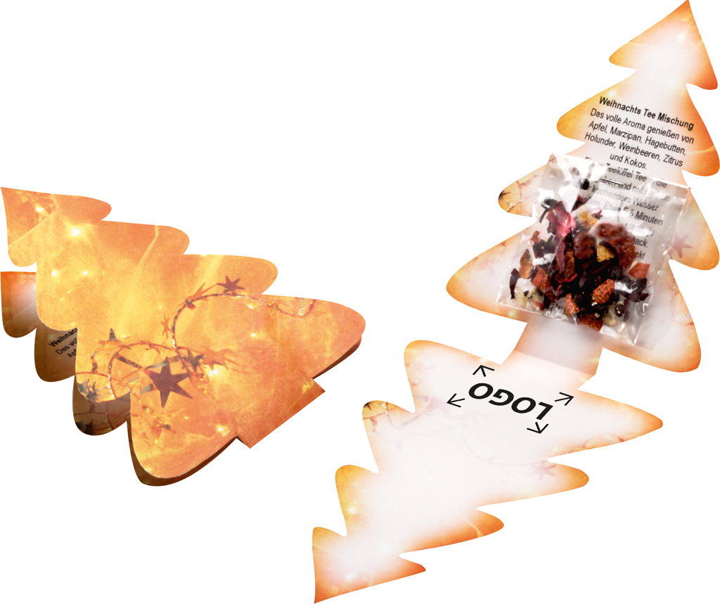 Beschreibung: Das Klappkärtchen in der Form eines Weihnachtsbaumes. Eingelegt im Tütchen ist ca. 2 g Weihnachts-Früchtetee, ausreichend für 1 Tassen Tee. Ein Genuss in der Advents- und Weihnachtszeit. Platz für den Werbedruck ist auf dem Standardmotiv der Karte oder eine eigene Gestaltung, jeweils ab 500 Stück.