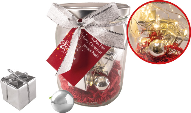 Inhalt: LED-Lichterkette (ohne Batterien 2x CR2032), 4 silbernen Weihnachtskügelchen, 3 Geschenkpäckchen