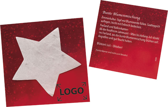 Beschreibung: Ein Stern, der auch in der kalten Jahreszeit wachsen kann. Das Samenpapier einfach auf das Erdreich legen und wässern. Bald werden die ersten grünen Spitzen zu sehen sein. Ab 250 Stück kann die Karte im Standardmotiv mit einem Werbeeindruck oder auch vollständig individuell gestaltet werden.