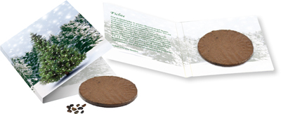 Beschreibung: Dieses Kärtchen beinhaltet alles für die Anzucht eines eigenen Weihnachtsbaumes. Eine Erdtablette und der Fichtensamen sind beigelegt. Die Pflanzanleitung ist auf der Innenseite des Kärtchens aufgedruckt. Platz für den Werbedruck, ab 250 Stück auf dem Standardmotiv, ist auf der Vorderseite des Kärtchens. Eine eigene Gestaltung des Kärtchens ist ebenfalls bereits ab 250 Stück realisierbar.