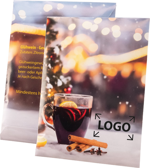 Beschreibung: Entdecken Sie die perfekte Mischung für Ihren winterlichen Genuss. Unser Glühweingewürz verleiht Ihrem heißen Getränk eine einzigartige Note mit den aromatischen Gewürzen Zimt, Zitronenschale und Nelken. Das Tütchen bietet viel Platz für Ihren Werbeeindruck oder, ebenfalls ab 1.000 Stück, für eine individuelle Gestaltung.