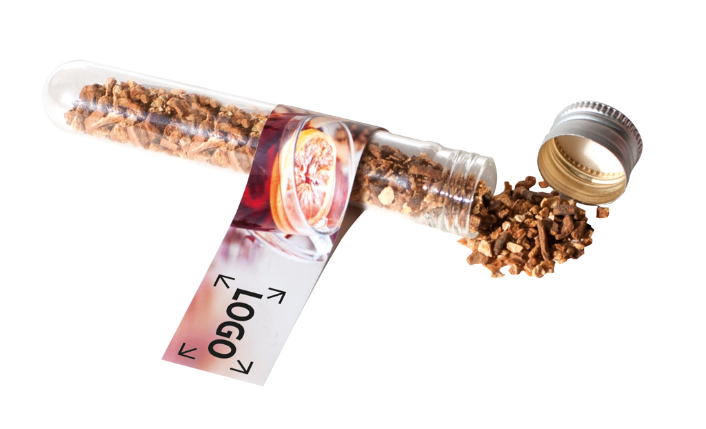 Beschreibung: Das Reagenzglas ist eine pfiffige Idee Glühwein-Gewürz (ca. 6 g) zu verpacken. Mit dem Schraubdeckel kann es immer wieder neu gefüllt werden. Platz für den Werbedruck ist auf dem Standardmotiv des Fähnchens oder eine eigene Gestaltung, jeweils bereits ab 250 Stück.
