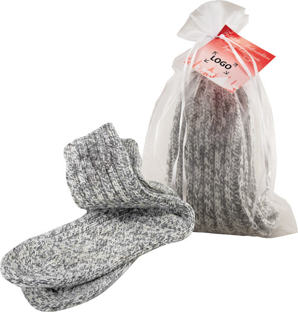 Beschreibung: Die Lösung für kalte Füße. Diese Schafswoll-Socken wärmen kalte Füße an den langen Winterabenden und sind in jedem Kleiderschrank unverzichtbar. Alles ist schön verpackt in einem Organzasäckchen. Das Kärtchen bietet viel Platz für Ihre Werbebotschaft oder, ebenfalls ab 100 Stück für Ihre individuelle Gestaltung.