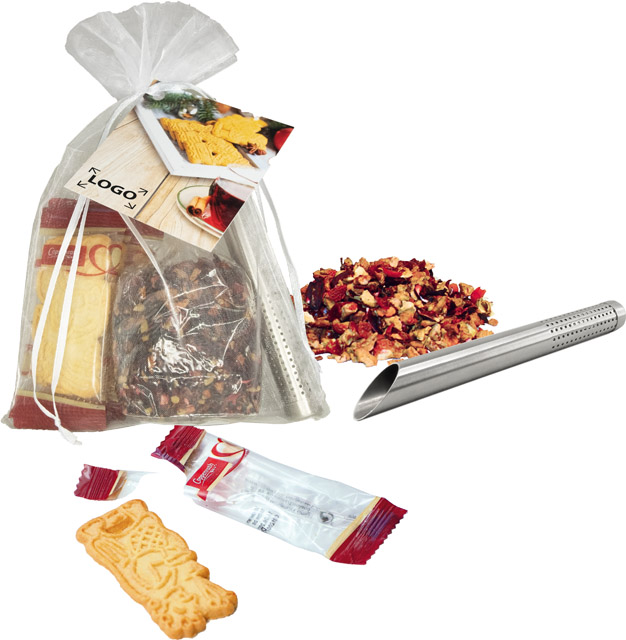 Beschreibung: Eine kurze Auszeit im Alltagsstress. Das gelingt mit einer weihnachtlichen Teestunde. Das formschöne Edelstahlteesieb ist mit dem Weihnachtsfrüchtetee schnell und einfach gefüllt, dazu leckere Butterspekulatius-Kekse. Das Anhängekärtchen bietet im Standardmotiv viel Platz für Ihren Werbeeindruck. Eine individuelle Gestaltung ist auch ab 250 Stück möglich.