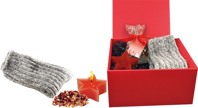 Beschreibung: Dieser rote Präsent-Karton beinhaltet alles für einen gemütlichen Wintertag: ein paar warme, mollige Socken, eine rote Stern-Kerze sowie ca. 50 g Weihnachts-Früchtetee. So kann man es sich auf der Couch gut gehen lassen. Platz für den Werbedruck ist auf dem Standardmotiv des Anhänge-Kärtchens oder eine eigene Gestaltung des Kärtchens, jeweils bereits ab 100 Stück.