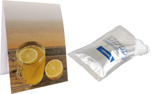 Beschreibung: Nach einem Spaziergang im Schnee oder um einer Erkältung in der kalten Jahreszeit vorzubeugen ist ein Glas heiße Zitrone genau das Richtige. Schnell und unkompliziert mit heißem Wasser angerührt. Für Ihren Werbeeindruck gibt es ausreichend Platz auf dem Standardmotiv der Karte oder, ebenfalls ab 250 Stück, für eine eigene Gestaltung.