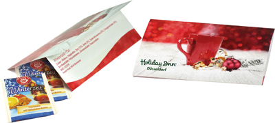 Beschreibung: Dieses Klappkärtchen enthält 2 Teebeutel mit Winter-Tee für den besonderen Genuss in der kühlen Jahreszeit. Einfach mal inne halten und sich eine kleine "Tee-Pause" gönnen. Platz für den Werbedruck ist auf dem Standardmotiv des Kärtchens oder eine eigene Gestaltung des Kärtchens, jeweils bereits ab 250 Stück.