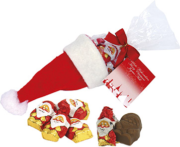 Beschreibung: Eine beliebte "Nascherei" zu Weihnachten, schön und originell verpackt. In der Nikolaus-Mütze sind 8 Schokoladen-Weihnachtsmännchen (je 5 g) enthalten. Platz für den Werbedruck ist auf dem Standardmotiv des Anhängekärtchens oder eine eigene Gestaltung, jeweils bereits ab 250 Stück.